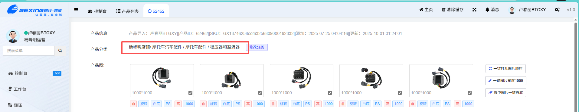你的中控台是卢春丽授权是卢春丽,但是产品分类是杨峰明,自行创建新的产品分类,然后把之前的产品改到新的卢春丽产品分类里面