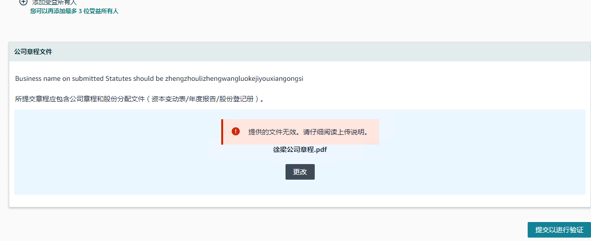 亚马逊后台提示让认证,之间提交过章程了,还是失败,请问怎么解决?